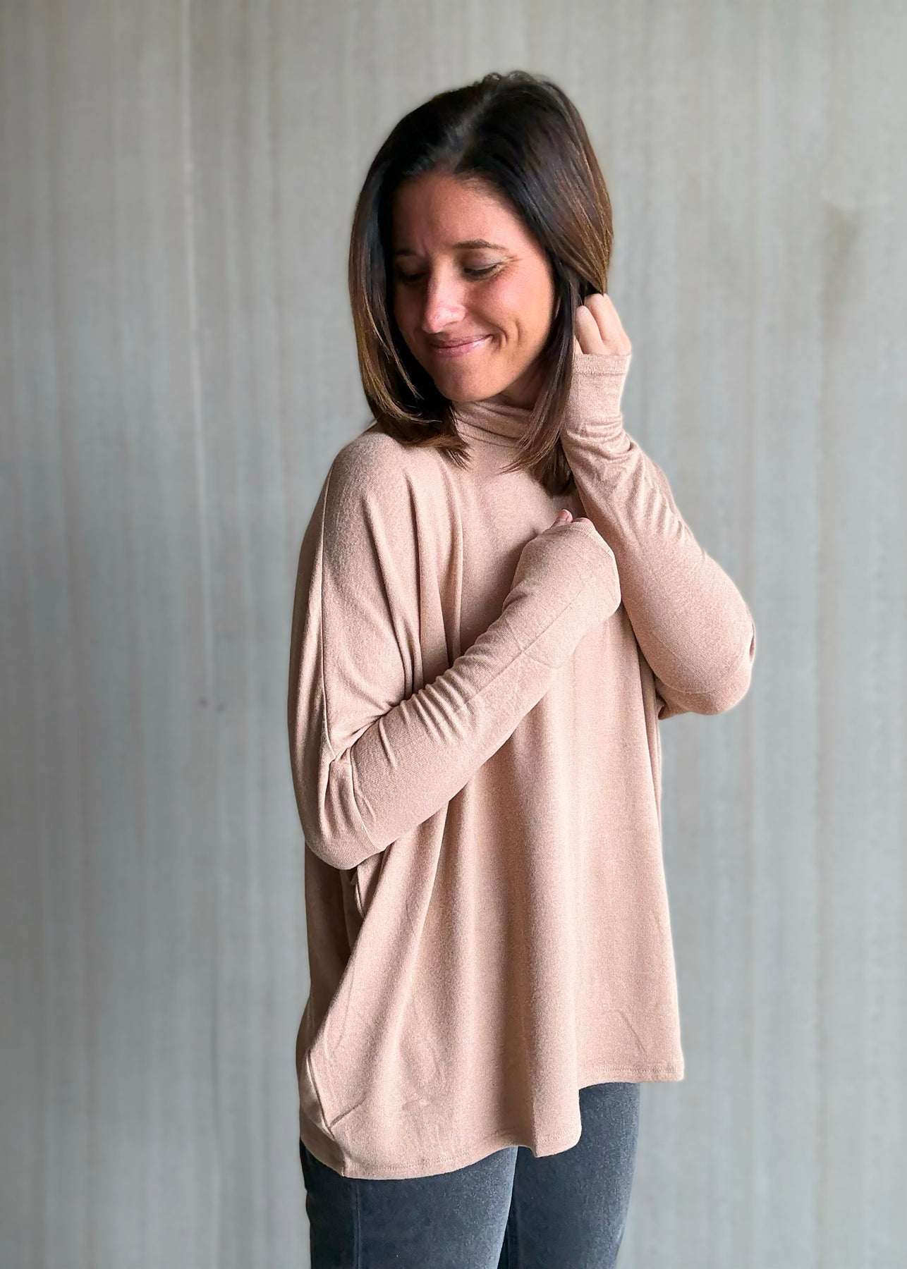 This taupe oversized turtleneck is the reliable piece every closet needs with its draped silhouette and dolman style. The relaxed fit and soft fabric work hard for you—wear it solo when weather permits, or layer it under jackets and dresses as temperatures drop. Pair with jeans, leggings, or trousers for a look that's always put-together without trying too hard. Simple, practical, and endlessly wearable. Shown styled with the Ultra High Black 90s Boyfriend Jeans by KanCan.
