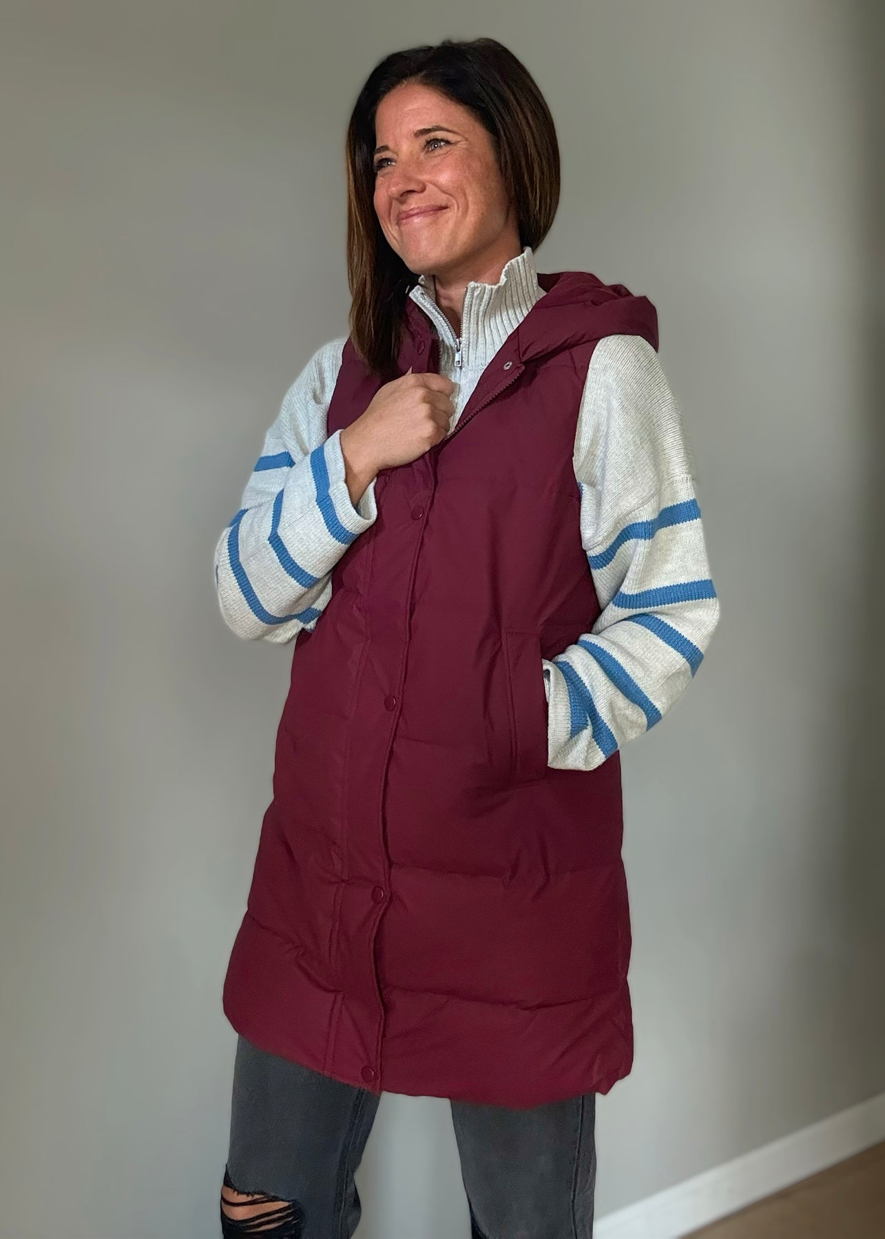 Hooded burgundy long line puffer vest with zip and snap closure along with front pockets. Shown styled over the Striped Quarter Zip Sweater and paired with the Ultra High Black 90s Boyfriend Jeans by KanCan.
