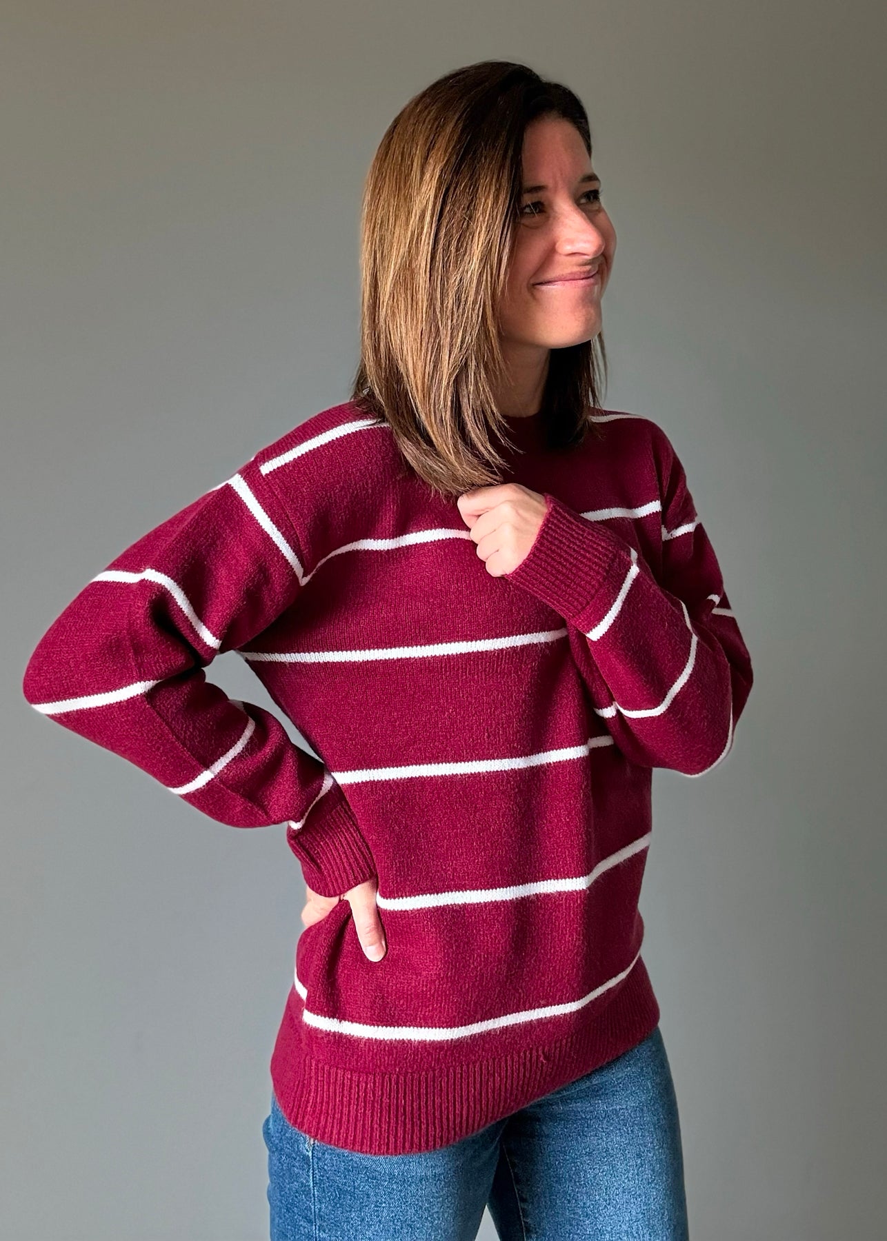 Maroon striped sweater with ivory stripes and a round crew neck.