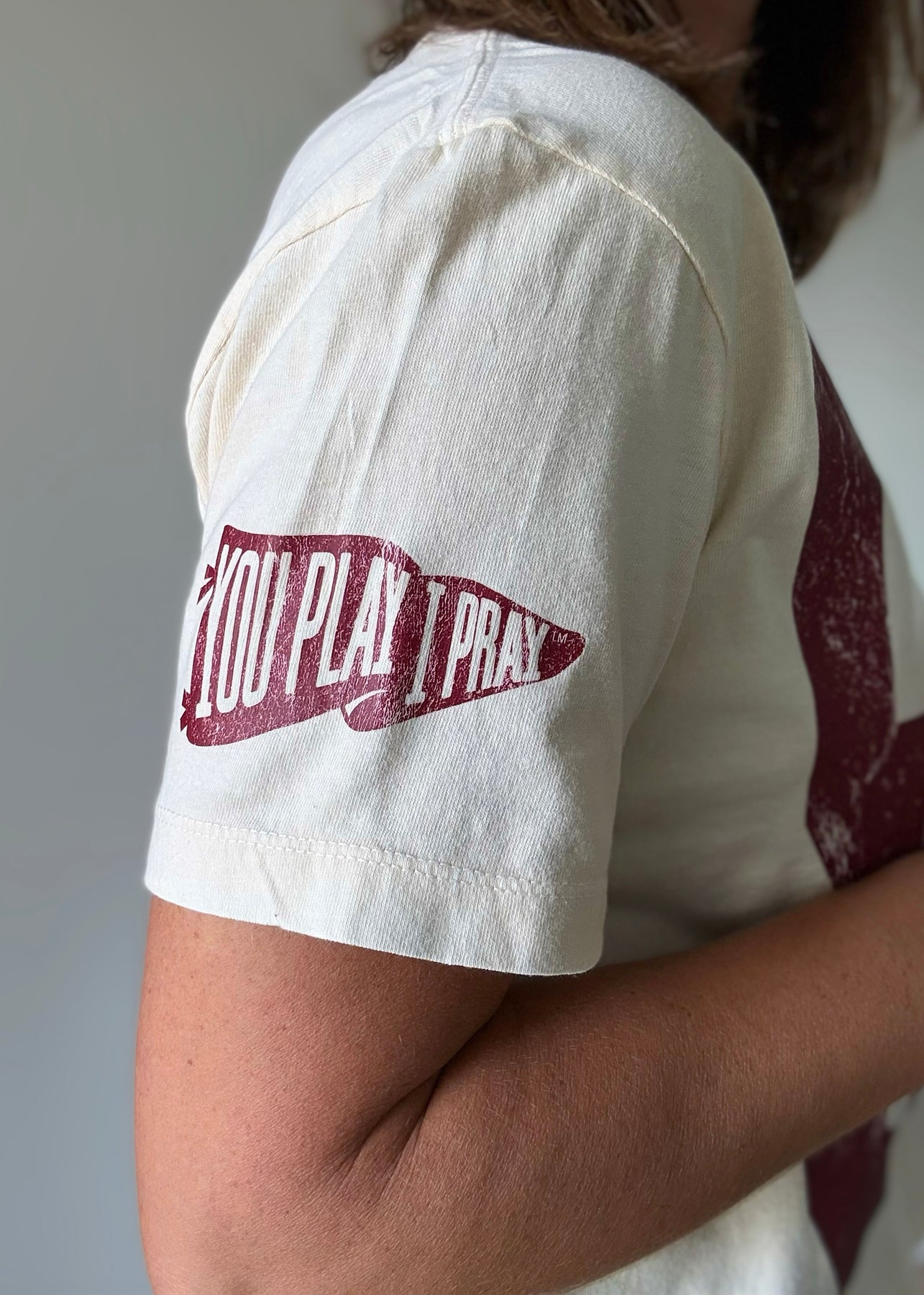 Boxy tee in a cream color with maroon graphics: large "SJO" on the front, "SPARTANS" on one sleeve, and the “YOU PLAY I PRAY” pendant on the other sleeve. Tee brand is Comfort Colors.