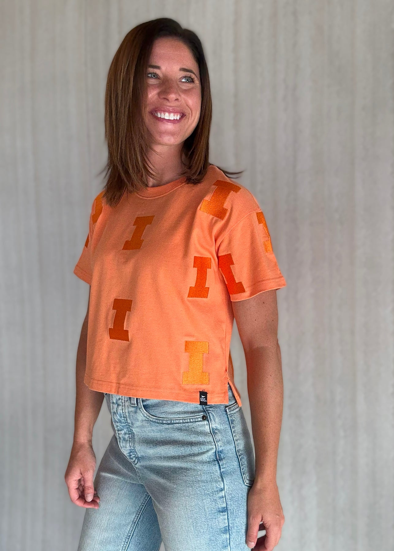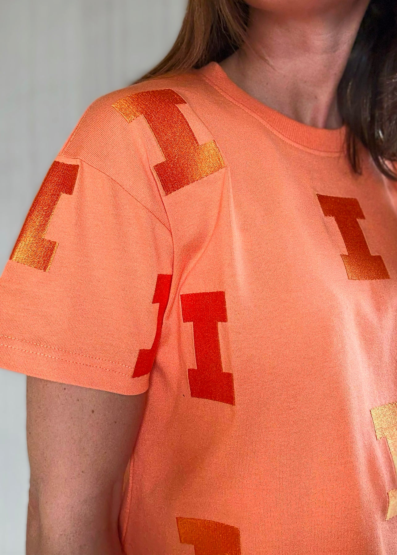 Meet the sister of the Illinois Varsity "I" Repeat Sweatshirt in sherbert orange colored t-shirt version! This heavyweight cropped t-shirt serves up a cool, boxy fit with a playful side slit and vintage vibes. Tee features the embroidered letter "I" throughout and is perfect for those who love a little extra charm in their game day look.