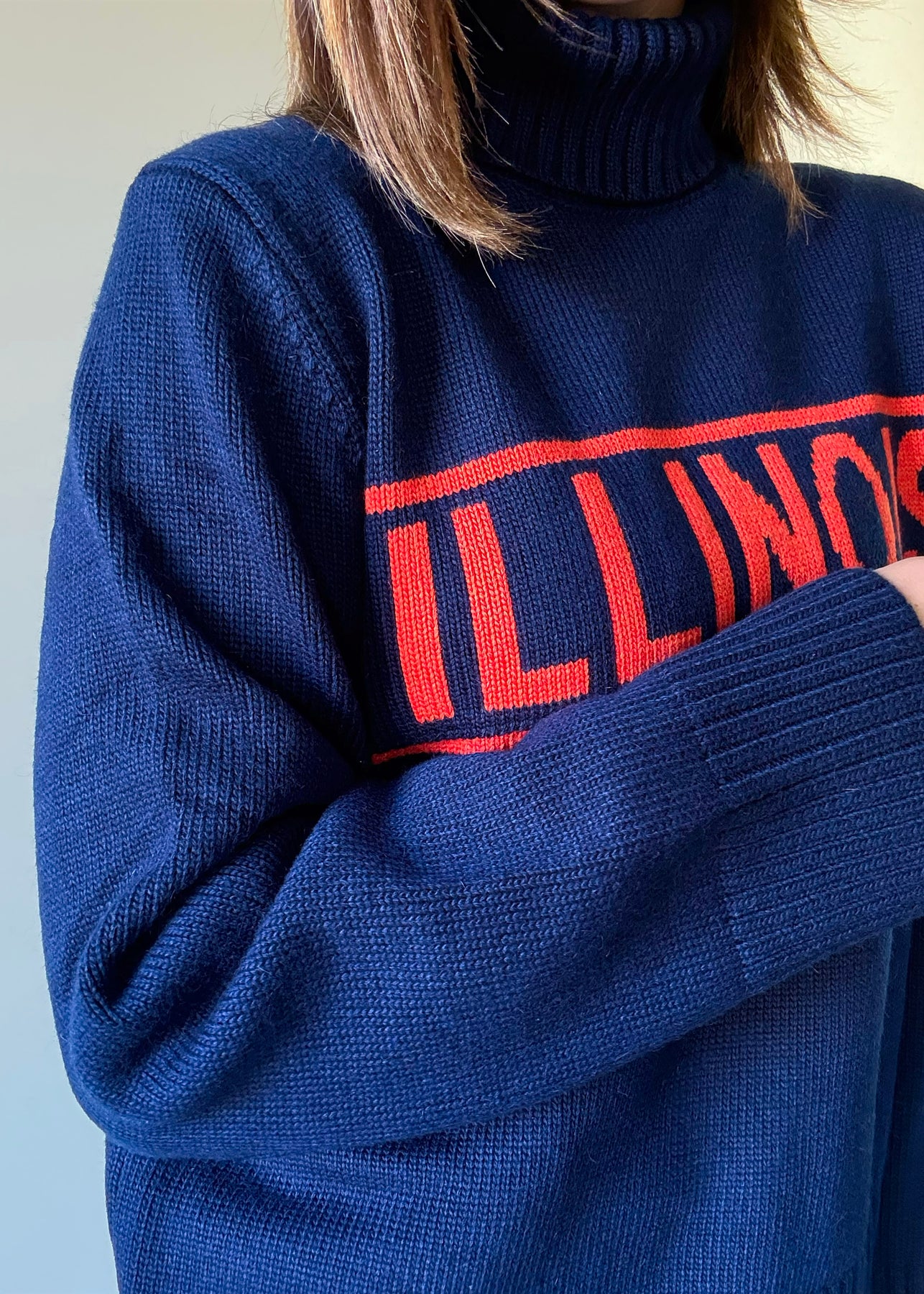 A refined take on Illinois fan apparel. This navy turtleneck sweater with orange Illinois lettering combines high-quality comfort with a classic, elevated look — perfect for showing your orange and blue spirit in style. We recommend sizing up one size if you prefer a roomier fit.