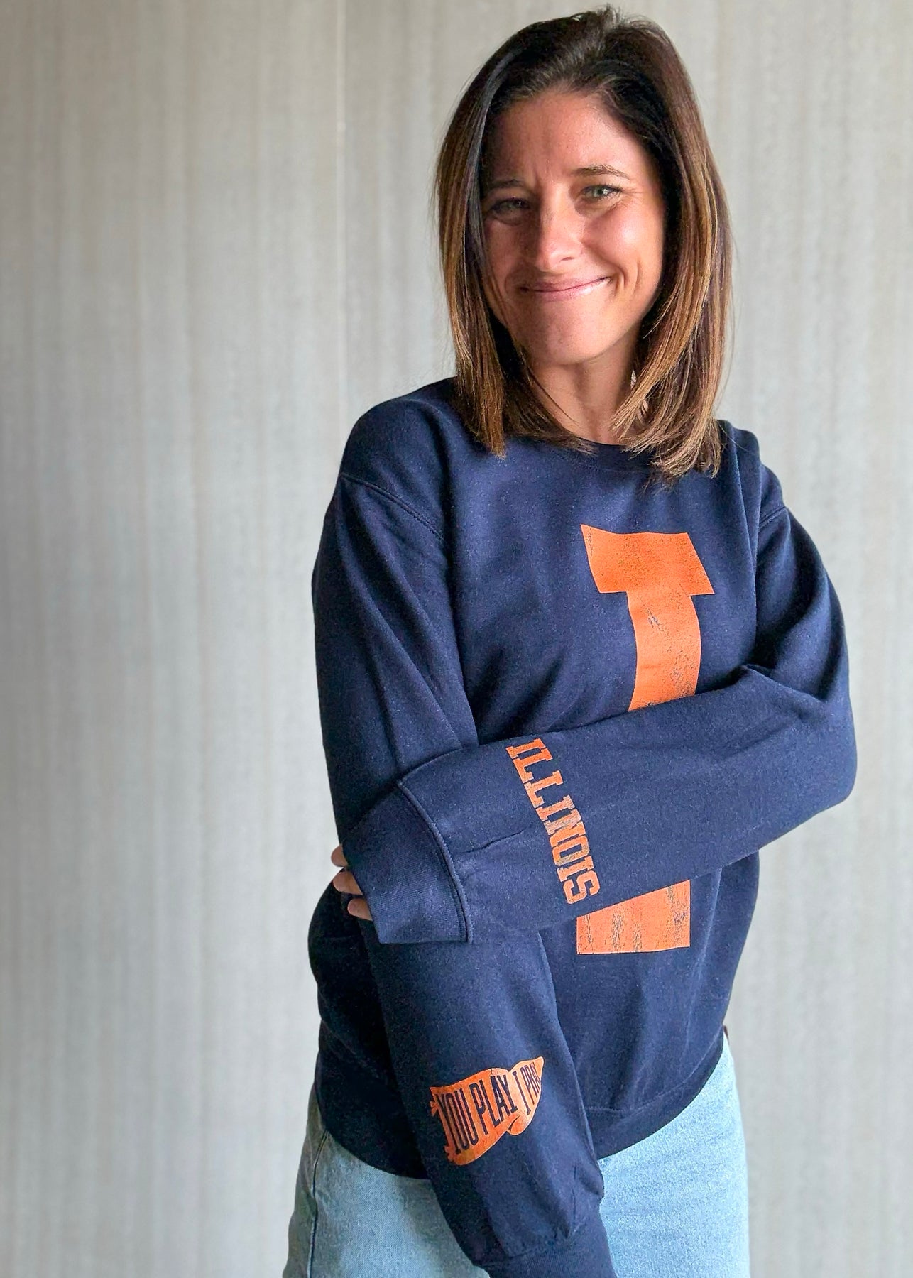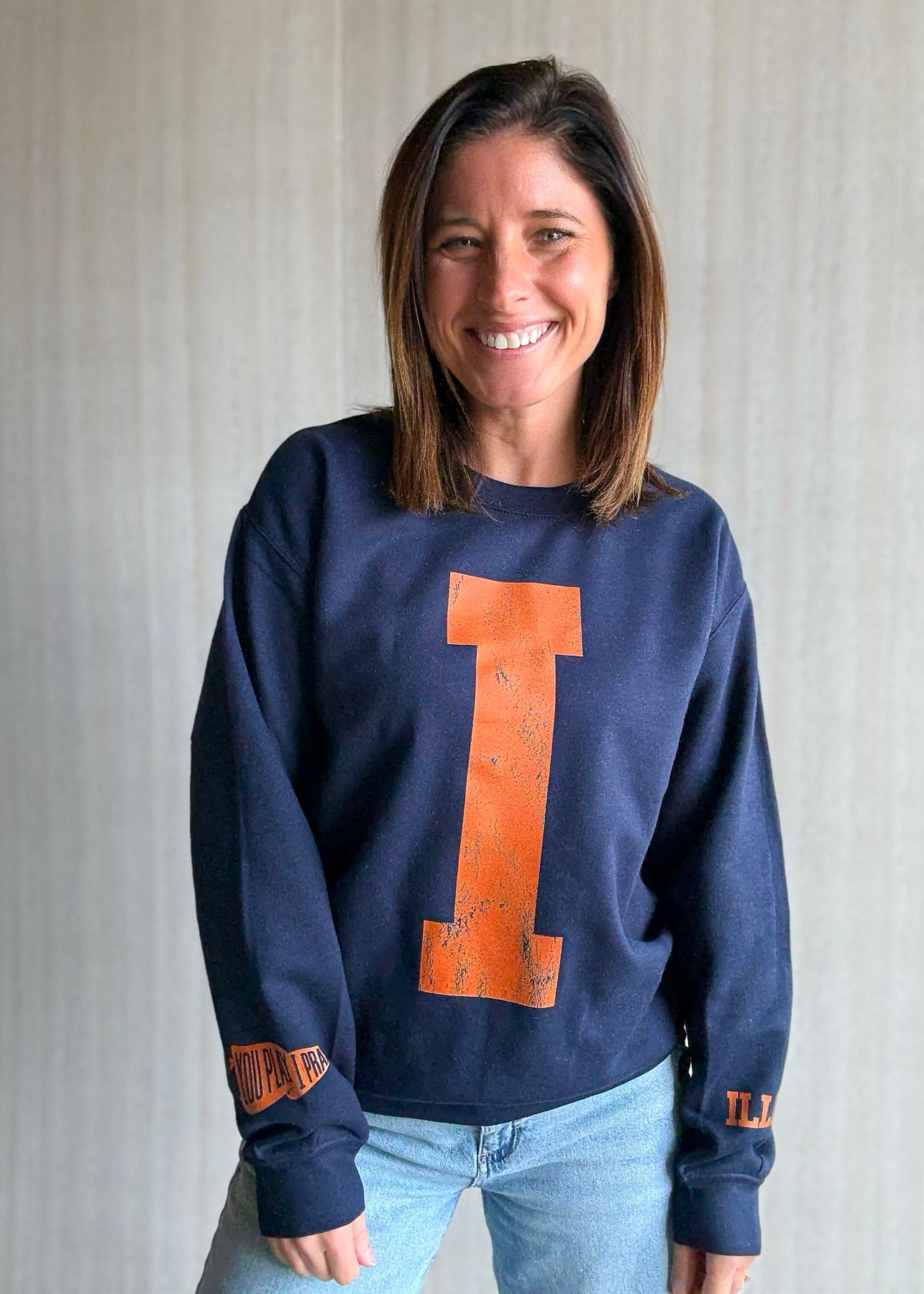 Illinois friends this one is for you! Navy blue crewneck sweatshirt with an "I" in distressed orange letters prominently displayed on the front. Each sleeve has orange text at the sleeve with one stating "ILLINOIS" and the other with the “You Play I Pray” pennant flag.