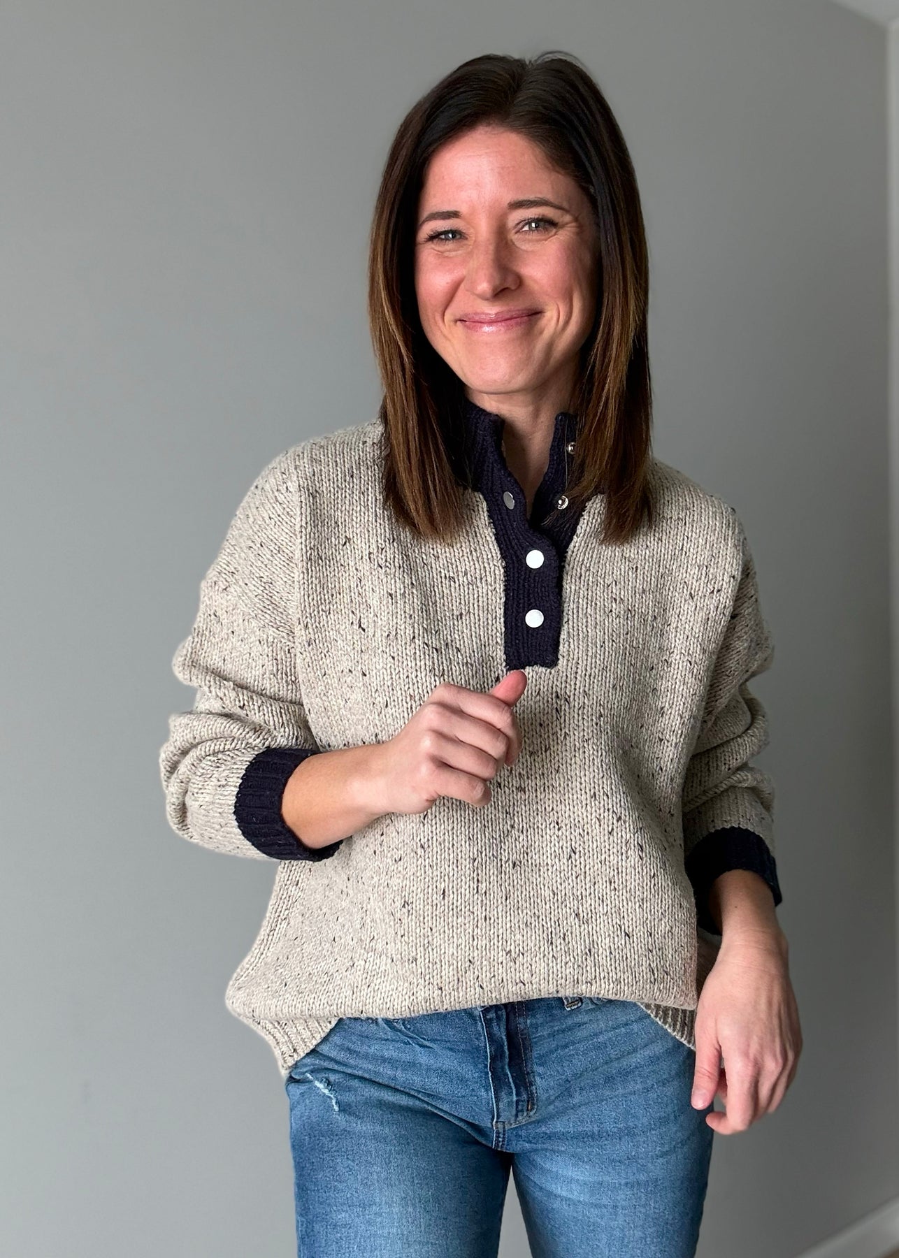 Cozy meets elevated in our Snap Henley Sweater, a laid-back essential with thoughtful contrast and texture. Designed in a soft taupe base, this sweater features navy blue accents along the snap-button collar and cuffs, adding a polished pop of color. Subtle navy speckling throughout the body gives it depth and visual interest, while lighter blue speckles woven into the navy trim create a perfectly layered look.